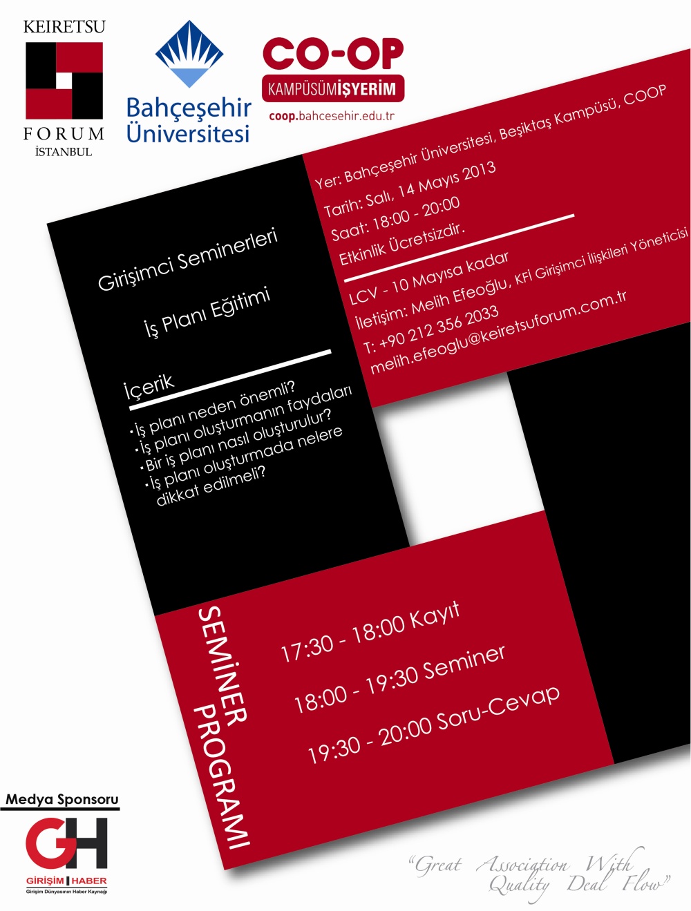 Bu seminerlerden ilki Bahçeşehir Üniversitesi Beşiktaş Kampüsünde yapılacak. Girişim Haber olarak medya sponsoru olduğumuz 14 Mayıs'ta ki bu etkinlikte girişimciler; bir iş planı hazırlamanın önemi, faydaları ve nasıl oluşturulacağı hakkında bilgilendirilecekler.