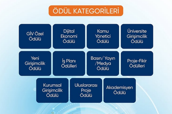 “12. GİV Girişimcilik Ödülleri” programı ise 29 Kasım (2025 ) akşamında saat: 18.00’de sahiplerini bulacak. Proje-Fikir Ödülleri, İş Planı Ödülleri, GİV Özel Ödülü, Kurumsal Girişimcilik Ödülü, Yeni Girişimcilik Ödülü, Üniversite Girişimcilik Ödülü, Kamu Yöneticisi Ödülü, Girişimci Akademisyen Ödülü, Uluslararası Proje Ödülü, Dijital Ekonomi Ödülü ve Basın Yayın Medya Ödülü olmak üzere toplam 11 kategoride 14 ödül verilecek.